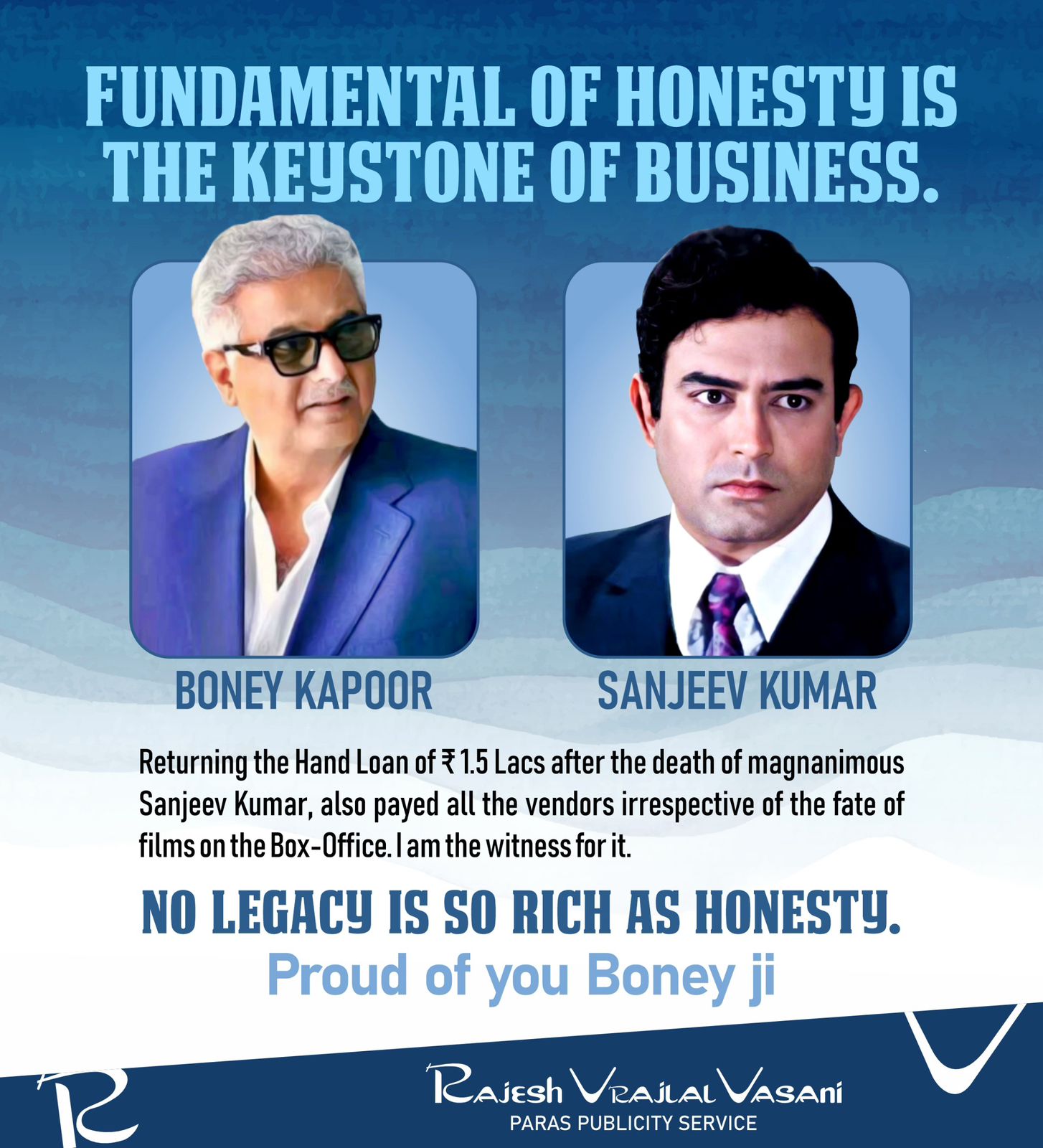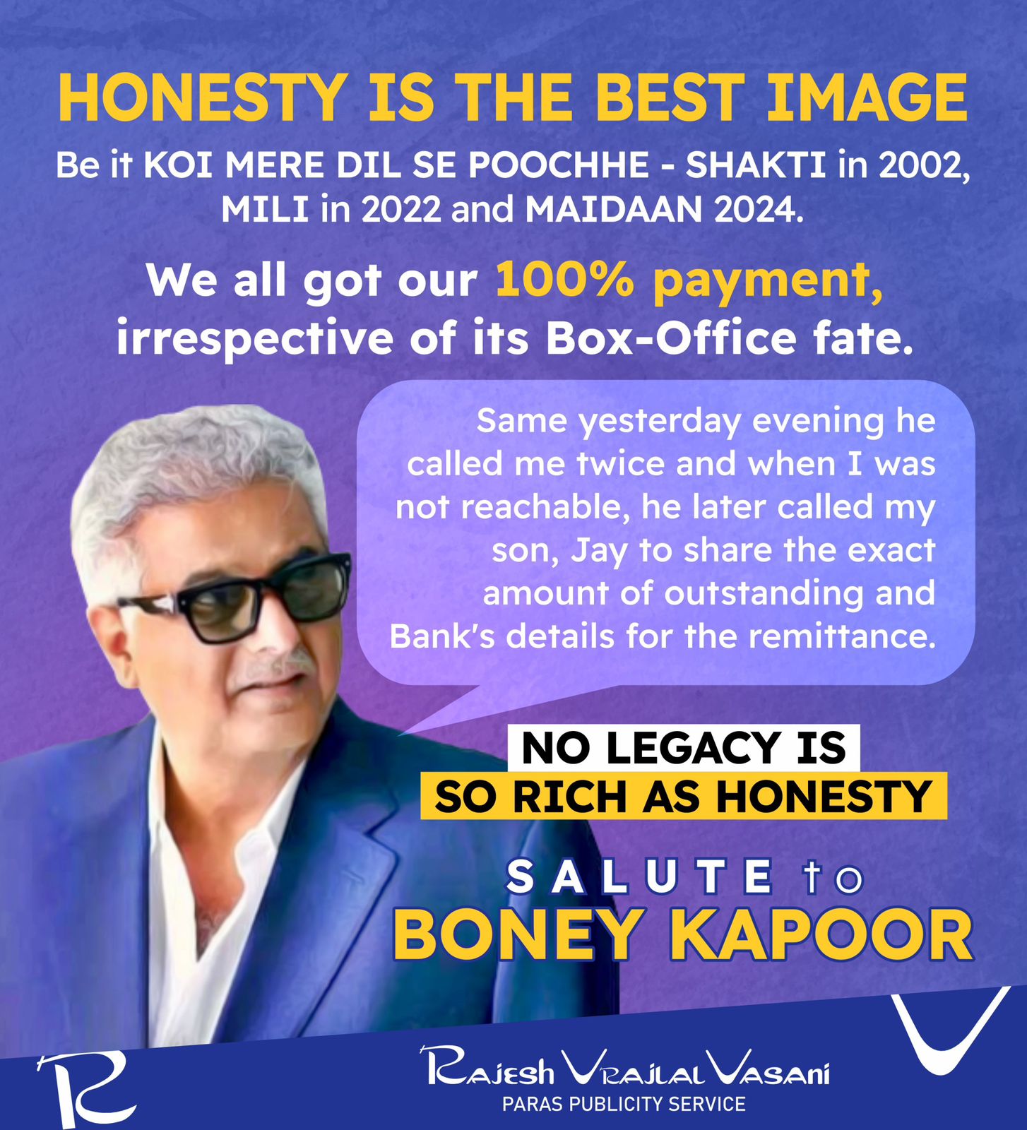 திரைத்துறையின் மூத்த நிபுணரும், Paras Publicity Service நிறுவனத்தின் உரிமையாளருமான ராஜேஷ் வ்ரஜ்லால் வசானி, சமீபத்தில் போனி கபூர் தனது நிறுவனத்தின் விற்பனையாளர், தொழில்நுட்பக் குழுவினர், மற்றும் இணை பணியாளர்களுக்கு படத்தின் வணிக வெற்றியோ, தோல்வியோ பொருட்படுத்தாமல், முழு தொகையையும் செலுத்தி வந்த வரலாற்றைப் பாராட்டினார். இந்த நடைமுறை, ‘Koi Mere Dil Se Poochhe’, ‘Shakti’ போன்ற பழைய படங்களில் இருந்து ‘Mili’ (2022), ‘Maidaan’ (2024) போன்ற சமீபத்திய தயாரிப்புகளிலும் தொடர்ந்துள்ளதை கவனித்து அங்கீகரித்துள்ளார் ராஜேஷ் வ்ரஜ்லால் வசானி என்பது கவனிக்கத்தக்கது .