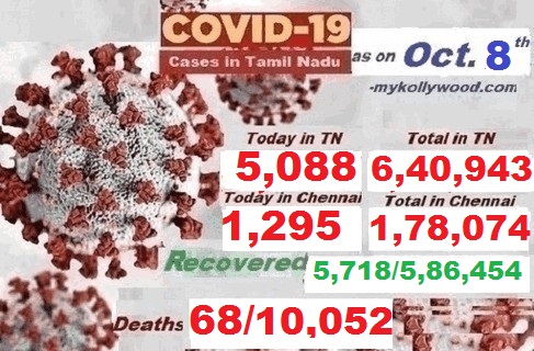 #Covid-19, #Coronavirus in Tamil Nadu – Latest News as on 8th Oct., Corona News By Cinema Journalist Union 714 Share தமிழகத்தில் கொரோனாவால் பாதிக்கப் பட்டவர்களின் எண்ணிக்கை 6,40,943-ஆக உயர்வு. இன்று மட்டும் 5,088 பேருக்கு கொரோனா பாதிப்பு உறுதிப்படுத்தப்படுள்ளது. தமிழகத்தில் ஏப்ரல் முதல் வாரத்தில் இருந்து கொரோனா பாதிக்கப்பட்டவர்களின் எண்ணிக்கை அதிகரித்த வண்ணமே இருந்தன. பாதிக்கப்பட்டவர்களின் எண்ணிக்கை 6,40,000–த்தை தாண்டியது. இன்றைய 5,088 எண்ணிக்கையுடன் ஒட்டுமொத்தமாக தமிழகத்தில் இதுவரை 6,40,943 பேர் கொரோனாவால் பாதிக்கப்பட்டுள்ளனர். தமிழகத்தில் இன்று 5,088 பேர் புதிதாக பாதிக்கப்பட்டனர். இதில் 1,295 பேர் சென்னை சேர்ந்தவர்கள் ஆவார்கள். இதனால் சென்னையில் பாதிக்கப் பட்டவர்களின் எண்ணிக்கை 1,78,074. இன்று 5,718 பேர் குணமடைந்து வீடு திரும்பியுள்ளனர். இதுவரை மொத்தமாக 5,86,454 பேர் குணமடைந்து வீடு திரும்பியுள்ளனர். இறப்பு –68/ 10,052 714 Share